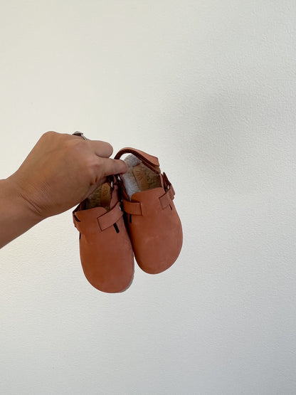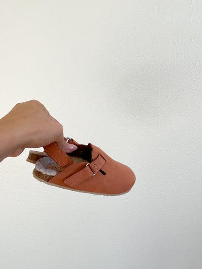 Clogs in 100% leather suede. Adhesive strap closure at front and back for a better fit. Lightweight rubber soles. Sherpa on the inside. Retails for $55.90